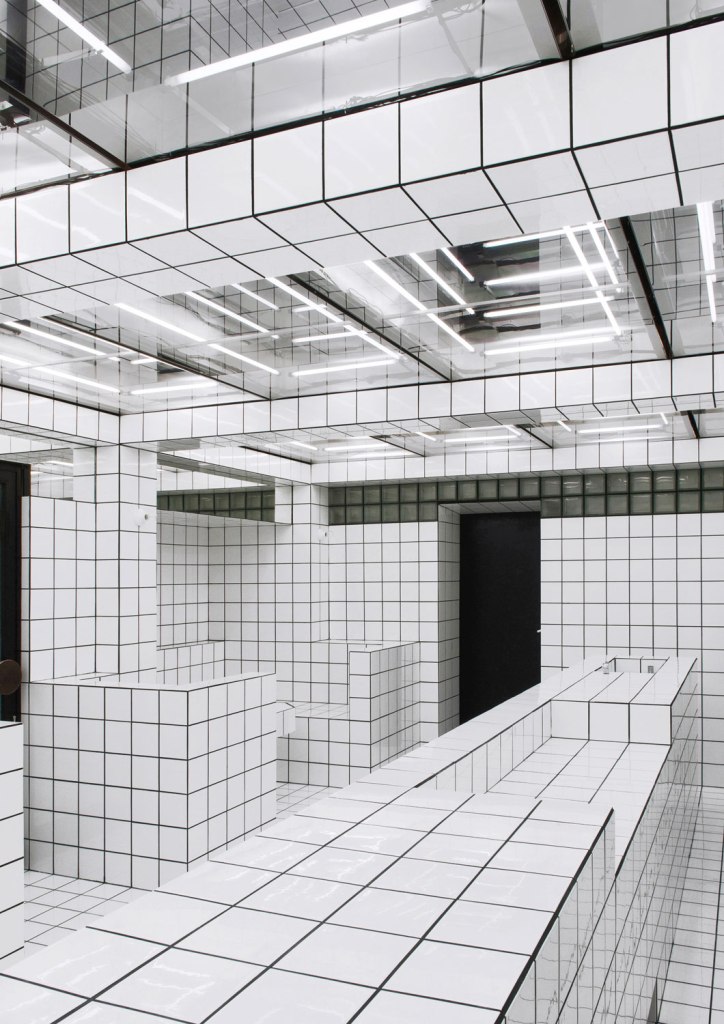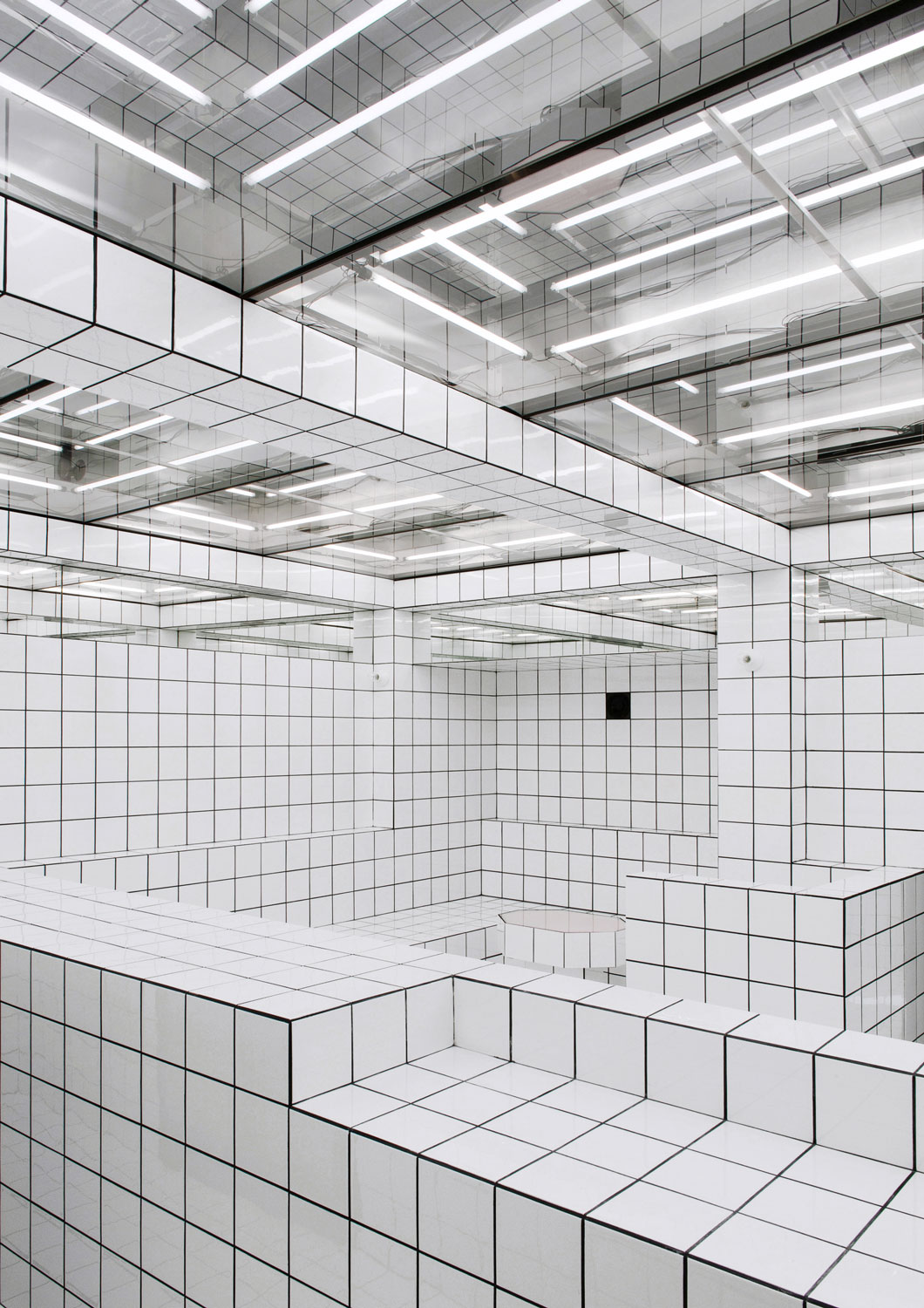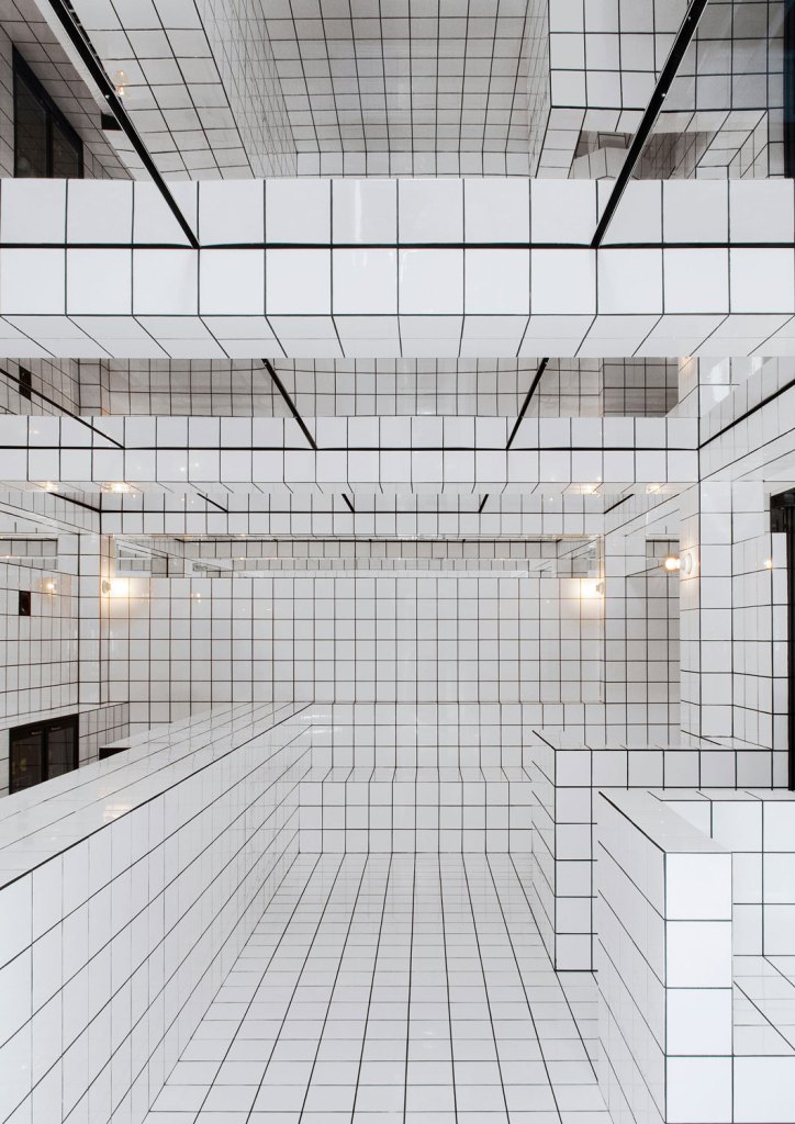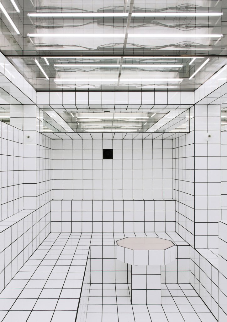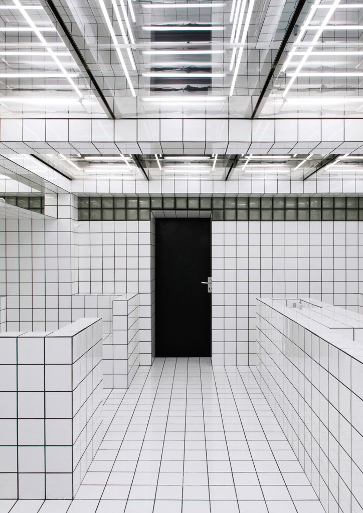The French artist Jean-Pierre Raynaud is known for tiling entire houses with white square tiles. His intention was to use a mundane mass article to create absolute spaces characterised by a rigid grid. His La Maison de la Celle-Saint-Cloud in Paris, which opened in 1974, was both his residence and an art installation at the same time. The walls, floors, ceilings and fixed furniture were completely covered in white ceramic tiles measuring 15 x 15 cm. The black grout between the tiles created the minimalist grid that also characterises the LAX BAR: an all-over design of tiles and grout that repudiates practically any direct reference to the outside world. A variation of the Loos Bar in terms of proportion and interior design, the LAX BAR also makes use of mirrors as the basic form of pictures as a way of inscribing visitors into the architecture. While the side mirrors are mounted in such a way that one cannot see one’s reflection, the mirrored ceiling transforms the lively space into a mise en abyme, an infinite image within the image.